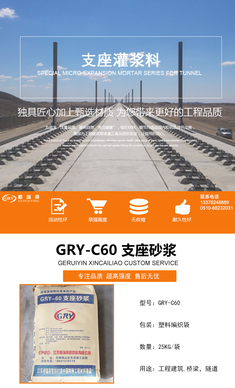 产品简介:C60支座砂浆 主要性能指标 项目 GRY-C40 GRY-C50 GRY-C60 GRY-C70 GRY-C80 GRY-C90 抗压强度(MPa) 2h / / / 20 / / 1d 20 25 30 40 / 55 28d 40 65 65 65 80 65 56d 60 65 65 65 80 90 90d 不降低 不降低 不降低 不降低 不降